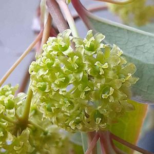 近所の農家さんの生垣を越えて天高く伸びるサルトリイバラ 枝が節ごとに曲がって伸びる姿に目😳を引き、農家さんに声をかけたら、長い鎌の先で引きずり下ろし枝を分けてくれた☺️ 団扇のような葉も、淡黄緑色の小さな花も可愛らしい 地方によっては葉で饅頭や餅を包む風習もあり五郎四郎餅やいばらまんじゅうとよばれるらしい