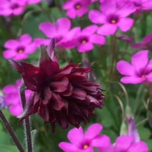 イモカタバミの中に入って、窮屈なのか西洋オダマキが、小さく咲いています。