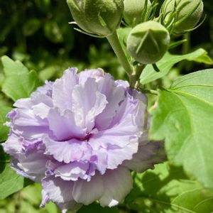 八重咲きムクゲ 紫玉 咲きました。 ツボミがついては黄色くなって落ちてしまい。やっとって感じです。