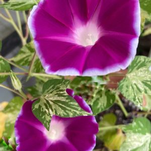 枝垂れアサガオ 紅ちどり 行燈仕立てとハンギング仕立て 二つ作ってみました。同じ袋に入っていた種だけど、白い縁どりの明確さに違いがあっておもしろい