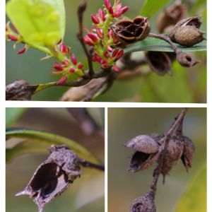 ★ 弾き飛ばしちゃおうシリーズ イスノキ 柞の木 マンサク科イスノキ属の常緑高木 静岡県以西〜四国〜九州、沖縄に分布 暖地の山地に自生 イスノキとの出会いは こんなふうに ガオーってお口を開けたような姿でした。 名札が無いので お名前調べ苦戦し、イスノキかなぁ?と投稿した時 皆さんが一緒に調べ考えてくださり わかりました。 ↑ 春 お花が咲く頃 まだ実殻が残ってました。 若い実を見のがしてしまいましたが、昨日投稿した トサミズキと似た感じて 丸い実に角のような花柱が残るそうです。 ↓ 秋 覗きに行くと、 すでに ガオーっと お口開けた姿になってましたよ。 昨日投稿した トサミズキと同じマンサク科のお仲間です。 7~10 ㎜の 蒴果は、完熟し乾燥すると 外果皮が2つに割れて 中から黒い種を弾き飛ばします。( 種子は膜状種皮に包まれており それがバネ仕掛けのように弾ける) って仕組みは トサミズキと同じなんですって! 確かに〜! 似てますね! トサミズキが ゴツくて凶暴なガオー こちらイスノキは ちょっと可愛げのあるガオー ぷぷぷっ 種を飛ばす威力のほどは なかなか文献が見つからず わかりません。 このイスノキ、お花よりも 果実よりも 虫こぶの方が注目度“大”なんです。 葉っぱも 実も 虫こぶだらけになるそうです。 お花と虫こぶの投稿 2021年 4/20 撮影 ↑2021 3/27 ↓2021 11/27 都立赤塚公園 ( 生物多様性保護エリアの近くだけど、その中の自生の木ではなく、公園樹として植えられた木のようです。)