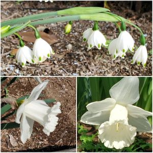 今日の庭 スイセン💠 上 連なる鈴蘭水仙 スノーフレーク💠 下 咲き進むにつれ 白くなってゆく ラッパスイセン💠 もう地面すれすれです