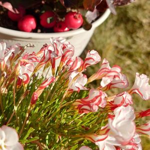 今日のお花の🩷オキザリス🩷 ①オキザリスパーシーカラー 蕾の時や花が閉じた状態の時の赤と白のストライプが現れる姿が特徴的で、とても可愛らしいです🤗💞 ②オキザリスパープルドレス 葉っぱの色が紫色のシックなオキザリスです🤚 ③ピンク色、黄色、白色と豊富な色のオキザリスのお花です🥰