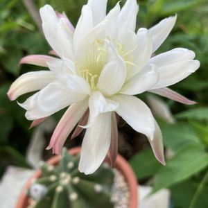 ☀☀☀☀🥵 カゴグループ🌵30輪目🌼 2枚目、月世界、種がたくさんできてる様だ😔放置 3枚目、ランポー玉🌼🌼 4枚目、室外機上の🌵も🌼🌼 5枚目、伸びすぎのフェルニアゼブリナをバラバラに。乾燥中