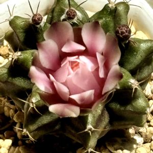 サボテン🌵 ギムノカリウム・牡丹玉 2018年伊豆に旅行、シャボテン公園で、思い出作りに小さなサボテンを一鉢に寄せ植えをしました。 その後、サボテン達は、我が家で元気で過ごしていました🌵🌵🌵🎵 少し大きくなったので、二年前、植え替えをしました。 今年、な・・な・・ななんと そのうちのひとつのサボテンから、蕾が出て、花が咲きました 薄いピンクの可愛い~お花🌹 7年越し・・・ これっぽっちも咲く気配がなかったのに~すんごくうれしいわ🎵😍🎵