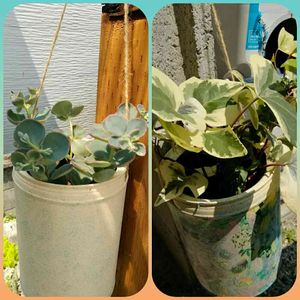 こんにちは👋😃 孫の粉ミルクの空き缶に色を塗って麻紐で吊るしてます😊 左はきゅうちゃんちから嫁に来て地植えにしてたミセバヤを挿し木しました🎵 右は職場にあった斑入りのアイビーを貰って挿し木しました🎵 ✋リメイクの才能は全くないです😣