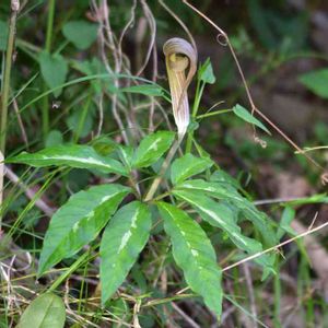 2021年4月1日(木)。 マムシグサ(蝮草)の花? ウラシマソウ(浦島草)に似ているが、花?から触手は出ておらず、また花の位置が葉より上にあることから区別する。蝮草よりも浦島草の方が気持ちが悪い。