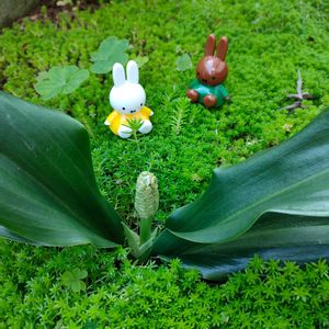裏庭のセダムの森で🌳 ミッフィーちゃんが かくれんぼ🐇 椰子の様に見えるのは タカサゴユリ🌴 花友さんがガチャのお人形たちを いっぱい持っていて 高松には ないよ〜って 捜して やっと 見つけたミッフィーちゃんです🤗