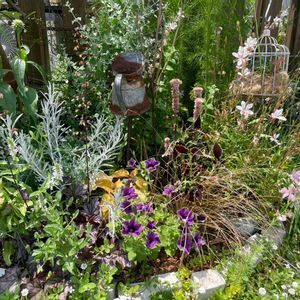 メイン花壇を夏バージョンに変更しました😆 主役はゲブラさんのペチュニア真輝です💜💚周りはカラーリーフで固めローメンテで🤣 ②ユキノシタ&ヤマアジサイ九重山 九重山だいぶ夏に枝が枯れたと思ってたけど蕾沢山ついてて一安心🤭 ③種からシノグロッサム この青綺麗ですね~💙 ④バプテシアダッチチョコレート 大好きな宿根草ですが花が今年も少ない🤣葉っぱだけ毎年増える😂 ⑤斑入りアメリカヅタ うちでは普通のアメリカヅタより目覚めが遅く棒きれ期間が長いけど気付けばモサモサになってます😂