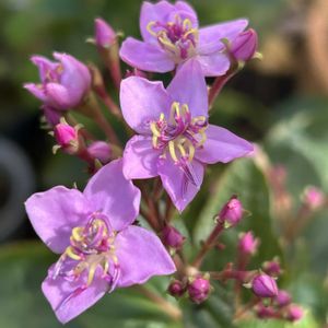 こんばんは♪ ハシカンボク「さくら小町」開花が始まりましたよ〜🌸🌸 ノボタン科ハシカンボク属の常緑低木 昨年の11月にポット苗でお迎え🪴待ってました〜🙌 何回か夏の暑さで水切れや葉焼けも起こして 心配してたけど咲いてくれて嬉しい可愛い💕 3枚目は火曜日に撮ったものです。