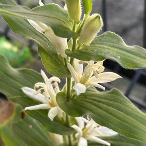 おはようございます♪ 斑入り葉ホトトギス三光斑 お花が咲き始めました💕 左端⬅️がホトトギス三光斑の葉っぱ 右端➡️は紫式部シジムラサキの葉っぱ🌿 この花が咲いてる葉っぱは緑が強いので先祖返り?💦 続々と咲いてくれる事を期待してます🙏