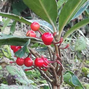 庭の定番 縁起木 万両の実 真っ赤に色づき 3箇所共今年は豊作だ♬ 白実も揃えたいと いつもこの時期思うが…… 南天の実が不作だったので 新年飾りはこれを使おう☺︎