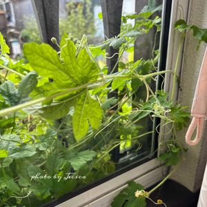 《ど根性ゴーヤ》 今年は入って来ないなぁなんて思ってたら 何となんと知らぬ間に住居不法侵入🤣 窓サッシを開けた事も無いのに どうやって入って来たのか不思議
