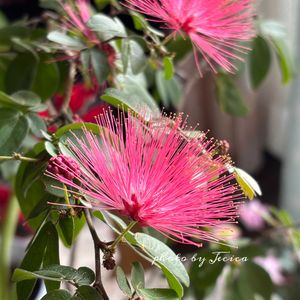 真っ赤なこんな花が年中咲くはずの鉢植えの四季咲きネムノキ 春に枯らしてしまったけれど 2枚目の様に新葉が出て来て成長しています 3枚目 グリーンアイスの花一輪 4,5枚目 カリブラコア カリー®️ダブル