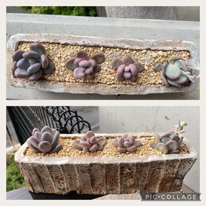 先週行ってきた多肉とみどりのマルシェで 持ち帰れないだろうな、と購入を諦めた 陶器で出来た多肉鉢さん イベントから帰ってインスタをチェックしたら ネットで販売されると知り、またまた購入してしまいました💦 本業はすり鉢職人さんで 多肉鉢を1000個作るのを目標にして 一点モノの鉢を製作されています 5点購入したうちの一つに 寄植えしてみました🪴 使ったメインの多肉さんは 以前購入した寄植えの多肉さんで 徒長した子達をカットしたもの 3個だけ家の子をカットして使用 セダムも伸びに伸びた子達をカットして使用 再利用寄植えです😅 ちょっと色々使い過ぎてごちゃごちゃしてますね💧 ベランダではありましたが雨が降る小寒い中、 パパッと寄せたにしては まあまあな出来になったかな😅 人生で3作品目の寄植え まだまだ下手っぴで粗がたくさんありますので見て見ぬふりして下さい🙇♀️