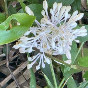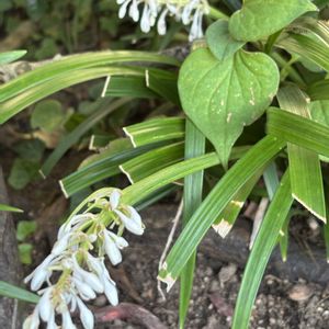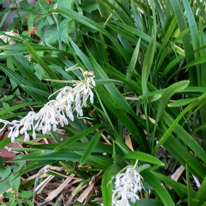 ノシラン(熨斗蘭) もう咲いていました。緑道沿いのお家に。 白い花が早朝の光を浴びて輝いていました。 瑠璃色の実を見るのが楽しみです♪♪♪