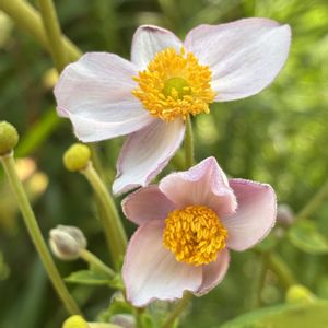💐秋の花💐に会えました〜🫶 1️⃣2️⃣ シュウメイギク(秋明菊) 花弁のチグハグがなんとも可愛い💕 シベもたっぷり💛 3️⃣ ノシラン(熨斗蘭) 真っ白で清楚なランです♪ 4️⃣ ヤブミョウガ(薮茗荷)の実 ステキな藍色💕 5️⃣ 真っ黄のオミナエシ群落にワレモコウ❤️ 池のほとり 素敵な光景でした💛 久しぶりのフラワーボランティアついでに公園はしご🤣 真夏のような暑い中🥵 ちゃんと季節は動いてた♪(๑ᴖ◡ᴖ๑)♪