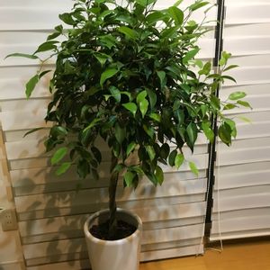 スーパーの隅に追いやられていたベンジャミン。 一週間前に見て、ずっと気になっていたのですが、今日覗いてみると、ポツンと一つ売れ残っていました。 しかも、なんと300円。 連れて帰って、植え替え。 枯れた葉と枝を剪定してこの形に。 ベンジャミンって、環境変化に弱くて、落葉してしまわないか心配ですが、 元気になって欲しいです!