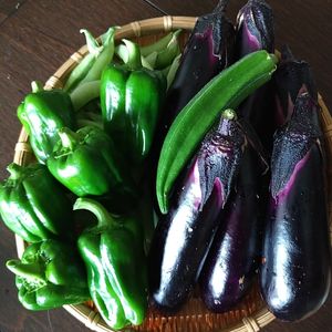初オクラ👏 少し大きくなりすぎたけど昨年は収穫ゼロだったので夫は大喜び🎶 ピーマンは皮が柔らかいし🍆もそう 家庭菜園ハマりそう🥰