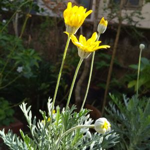 咲き始めたユリオプスデージー 陽射しを浴びて花も🌿も キラキラ輝いています
