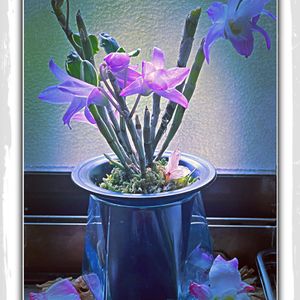 【Kazyan’s Collection:長生蘭編④】《再投稿》 ♧セッコク: 石斛/長生蘭:Dendrobium monil ♡この写真画像は、「セッコク:長生蘭」の斑入り🍃葉っぱの「富士鶴」という名称の蘭がほぼ満開に咲いたもので、楚々としているけど、どこか雅やかで可憐な花は美麗なので撮影してみましたデス🐶 ♧最後に一花だけ残っていますが、他の花たちは落下してしまいましたが、鉢の周辺上に置いて、ドライフラワーにしています。 最後に残っていた花蕾が開花して満々開に咲いた様子を撮ってみましたデスら😸 尚、この長生蘭は、3月10日編①と23日編②及び4月2日編③で投稿したものと同じものデス😸 📝以下は、編①②③の内容と同文デス🙏 📝画像では、デンドロビウムのように全体が大きく見えますが、背丈のほどは約10cm程度の可愛らしい長生蘭で、植えている鉢は約5cmほどの物デスが、鉢ごとガラス容器の中に入れてみましたデスら😸 【詠歌献上】 『富士鶴の長生蘭雅なり 暫時魅入りて癒さるる哉』 @"For a while, it's healing to be fascinated by the graceful blooming of Dendrobium monil called "Fujitsuru". 大意:しばらくの間、「富士鶴」と呼ばれる長生蘭の優雅な開花に魅了されるのは癒されることです。 🌸花言葉:「私を元気づける」「豊かな笑顔」 「私を元気づける」は、葉のなくなった茎に咲く花の姿と健胃や強壮などの薬効があることからきているのかな? 葉がなく節が目立ち、枯れたような茎から短い花茎を出して咲く楚々とした花の姿を見ていると、癒されて元気づけられ、つい笑顔になってしまいます😸 【豆知識】 セッコクは漢字では石斛で、本来は中国産の近似種(D. crispulum、D. Kwantungenseなど)に当てられた名称であり、健胃、強壮作用などがあり、漢方薬として用いられている 。 現在は、細葉石斛D. hancockiiなども使われる。 本種は薬用にされることから、記紀神話の医療神である「少彦名命:すくなひこなのみこと」にちなみ、「少彦薬根:すくなひこなのくすね」の古名も持っている。 「セッコク」の呼称はセキコクが詰まったものであり、そのまま音読みにしたセキコクが使われる場合もあるが、「セッコク」と呼ぶほうが非常に多い。 本種はシノブ玉やイワヒバの鉢植え、庭木につけるなどの形で栽培されることが多い。 東洋ランとしての名称は、「長生蘭:ちょうせいらん」であり、江戸時代から古典園芸植物としても栽培された歴史がある。 長生蘭は花を楽しむものではなく、斑入りの葉変わり姿や模様の変化を楽しむものであって、野生で発見される葉変わり品などを選別・命名する形で、現在も栽培されている品種も多い。 しかし、昭和の終わりごろより花変わりにも関心が集まるようになりはじめ、花物の品種が多く登録されていくようになった。 花の美しさから園芸目的のための採集が多発し、自生個体数は激減し大株はほとんどなくなってきている。 とたえば昭和50年代ごろまでは神社・仏閣の境内の樹木に大株が見られることもあったが、現在ではそのようなものはすべて取り尽くされてしまっている。 ただし本種の繁殖力は強く、採集熱が冷めるにつれ次第に個体数は回復傾向にある。 増殖法は株分け、バルブの先の方から新しい芽が伸び根を生じさせたものを別の植木鉢などに植えて殖やすいわゆる「高芽採り」、あるいは古いバルブを切り離してミズゴケの中で腋芽の発芽を促すいわゆる「矢伏せ」などがあり、株の増殖は容易である。 なお、同属の熱帯産の種には洋ランである*デンドロビウムとして栽培されるものが多く含まれ、本種はデンドロビウムの園芸品種のうち矮性品種作出の交配親のひとつとなっている。 ☆Dendrobium(デンドロビウム)”という言葉は、ギリシャ語の“dendron(デンドロ;木)”と“bion(ビウム;生ずる)”に由来するもの。 文字通り、樹木や岩などに着生する“着生植物”と呼ばれる花です。 日本原産で、中部より南の地域に分布します。 漢方薬として利用されることから、別名「岩薬:イワグスリ」とも呼ばれています。 ✍️Works:Poetaster Kazyan//筍歌人 和堂 Artistic:Dendrobium monil/Orchid April 18,2022:past am 07:00':📱shooting April 22,2022:past am 03:00’:upload by Kazyan’s Green Studio