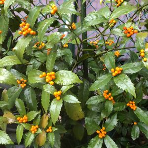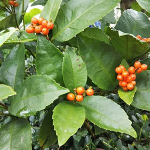 朝早くから小雨がたまに落ちて来たり日が差したり スッキリしないなか 千両のオレンジ が色づき始めました。 お正月まで持つかな⁉️