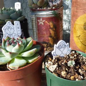 春の寄せ植えを仕立て直し。 庭のあちこちから植え替えのために多肉を集めて、自分で作ったプラバンのワイヤーピックを添えました(*´ω`*) 紅葉進むとより可愛く育っていくかな。
