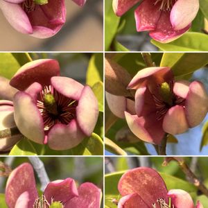 ①唐種招霊(からたねおがたま) モクレン科 常緑低木 半開状に咲く花 直径2~4cm あまり目立ちませんが〰︎ バナナ🍌のような甘い強い芳香 緑色の部分が雌蕊💚 触手のようなものが雄蕊 ②③④アロニア バラ科 別名 西洋カマツカ 直径2cmほどの小さな花 5弁花 突き出たシベの先端は 赤く膨らんでよく目立つ❣️
