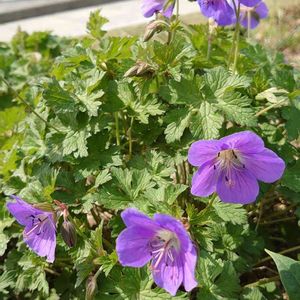 🏷(祝)チーム・ブルー10000pic 薄紫色のゲラニウムです。 Geranium ヨーロッパからシベリアに分布し、草原などに自生します。 草丈60〜70cm、茎は直立して枝を多く出します。花径は4cm前後で薄紫色、横向きかやや上向きに咲くきます。葉は深く5裂し、さらに細かく切れ込みます。分布が広いため変異が多く、園芸品種も多いです。
