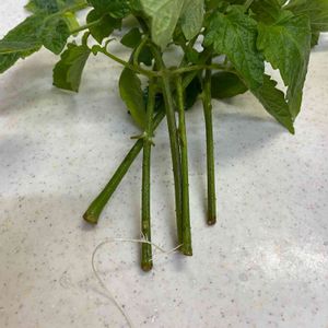 おはようございます☀ 挿し芽作りの水差しをキッチンでやっていますが、トマトから細い根っこが出てきました🍅 メネデールのおかげか1週間くらい? もう少し出てきたら、土に植えようと思っています😊