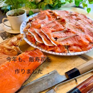 『今年は、無理だ😣と思っていましたけれど。。💦』新巻鮭の飯寿司を 漬けました😉🎶 『鮭がいない(;゚д゚)ェ…』から始まり、大根が不作でお届けできない💦 (大根農家さんからのLINE) そして、いつも頼んでいた生麹の業者さんが電話に出ない💦 ホームページが無くなった😳😅 などと、色々ありました タイヘンダァ!! ヾ(゚ロ゚*)ツ三ヾ(*゚ロ゚)ノ タイヘンダァ!! ①②新巻鮭を解凍して、塩抜きをし 鱗取り、三枚おろしをして一日陰干し、そぎ切りにしてから 大根、人参🥕生姜、ご飯🍚生麹 酢、酒、塩で漬け込みます ③出来上がった、飯寿司 これは、去年末の物です 1年の内で、私が1番働くのが 『この飯寿司作りです』⸜(* ॑꒳ ॑* )⸝ 1ヶ月後に食べられます😋 ④私の包丁たち🔪 ⑤飯寿司を作ってる間に、 エアープランツ コットンキャンディー- ̗̀ 🍭 ̖́-が咲きました‼️(๑♡∀♡๑) それにしても何とかなって。。 ∧_∧ ( -ω- ) ( つ旦O と_)_) ホッとしました〜⸜🎶