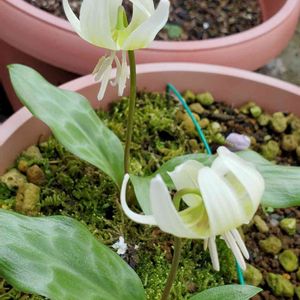 カタクリ🌸🌸🌸 初めてのカタクリです🎵 咲いてくれました💕 もっと小さいかと (スノードロップ位かと😆)思っていました 以外に大きくて びっくりです。 白とピンクで分けたのですが、 ちょっと小さいかな ( *´꒳`* )⸜🌷︎⸝ 葉っぱがカッコイイです🎵