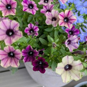 小輪ペチュニア マルベリー クリームが増えてきたけど、逆に濃い〜紫もある。気温なのか、紫外線なのか??不思議な色がわりだなあ。