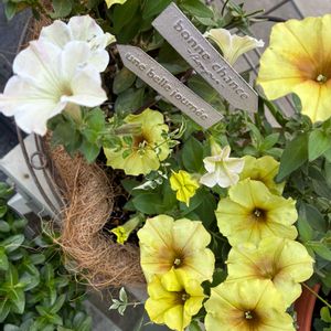花芳さんのペチュニア、マルベリー。1輪1輪花色の入り方が違っていて、とても絵になる。 もりもりで、隠れてきたけど、バスケット仕立て。かわいい〜。