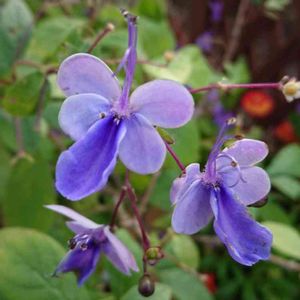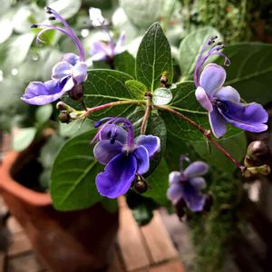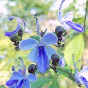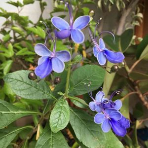 クレロデンドルム・ブルーウィング お休みをしていた花が咲き出しました。 クロアゲハやシジミ蝶が遊びに来てくれていますが、クレロデンドルムの蝶々も遊びに来てくれました😊 左右に広げた花びらと、雄しべと雌しべがグ〜ンと伸びて、蝶々🦋が舞っているように見えます。