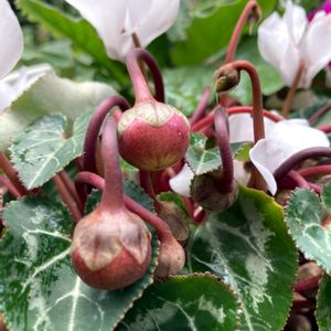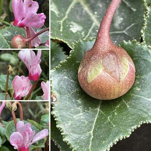 冬から春まで満開が 続いていたシクラメンの花 最後の一輪になりました^ - ^ コロコロの実 可愛いでしょう❣️ 固い粒が出来てます
