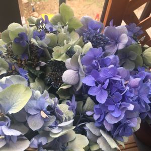 アジサイ「フェザー」ブルー。 ピンクとは全然雰囲気が違います。 写真だとゴチャついてますが 実物はすっきり可愛い子です。