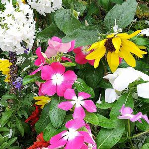 コミュニティ花壇 "今日のお花" ニチニチソウを中心に…梅雨明けが待ち遠しい‼️🤗💕✨🎶