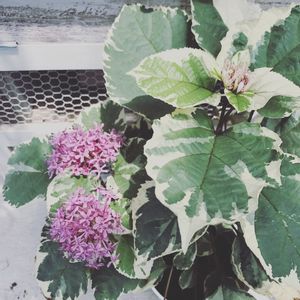 たまにはお花を…゚・*:.。❁ この時期に涼し気な斑入りの葉っぱにピンクの手毬花(*´艸`) 花の無い時でも葉っぱで楽しめるね*ˊᵕˋ*