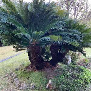 作業後のソテツ 手前側は根元付近サッパリして風が抜けるようになりました🌴 来客もあったりで作業はなかなか進みませんでしたが、助かりました♫ありがとうございました😊 あとは写真奥側は後日したいと思います🍃 上部中心付近はゴーグルがないと危険です💦 葉っぱの茎が固くてハサミ✂️が壊れました
