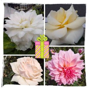 チーム・ブルーの… 花友さん… ㊗️くまるさん…100pic... (*˘︶˘*).。.:*♡🎉💐 おめでとうございます…🎁…😀!! 🚿🚿🚿🚿 🌸🌼🌺🏵️💠 🌱🌱🌱🌱🌱… これからも素敵なお庭の花たち…こ🐧ちゃんの植えたお花さんも…楽しみにしてますょ…🌺🌸🤍💚🏵️💜💠🌼💓💟🌺🌸🥀💛🏵️💠… 優しい色合いのバラ↗️↙️と白い八重咲きクレマチス↖️と…ピンクの可愛いダリア↘️で… 💛🤍🌸💚🥀💓🙆🏻♀️🌸💛🤍🌱🚿…
