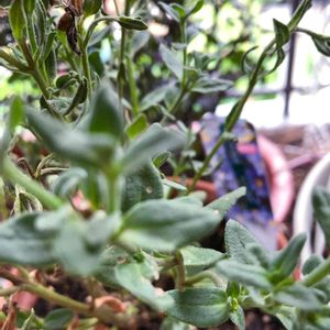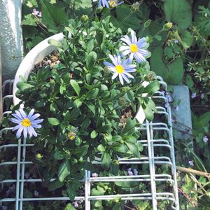 令和3年4月8日(木)晴れ☀️ おはよーございます*\(^o^)/* 小さい庭の朝の見廻りしています。 ブルーデイジーを探しに行って🚙🌬た店に入っていたので夏野菜用の土と一緒に😊連れて帰って来た葉っぱに班の無いタイプ🥰特に名前は?付いていないみたい💕