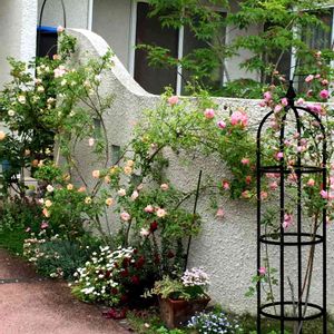 今日も寒いですね 天気は良いけど風が冷たいー🍃 お昼から雪マークついてましたがほんとかなぁ 笑 去年の春のpic📸 オベリスクはラレーヌヴィクトリア 奥に見える小さいバラはフィリスバイド そのまた奥の大輪はペッシュボンボンです 足元はその頃の気分で毎年変わります 笑 基本香りのするバラがすきです🌹✨