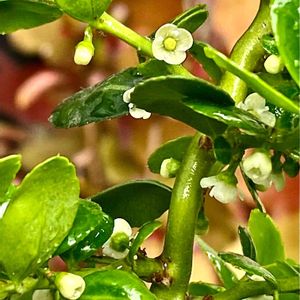 朝の束の間の陽射し あっという間に つぶつぶ天国になった スパイラル🐉いや、、、 花をつけた姿は 雲竜ツゲのほうが合う そう あれだ 花札の絵柄だな🎴