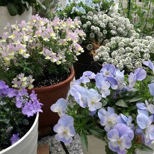 積雪の中☃️お外で元気!元気! ベランダ軒下テラスに避難している寄せ植え達。窓を開けるとすぐ手が届く場所だけど、花の上にも雪がすぐ積もるので😱毎日手で払っています️☃️ でも、この子達は寒さに強い💪 大好きなpwネメシアアロマンスと、ミルフルの寄せ植え。 ネメシアが少しずつ咲いてくれるといいな〜🌼