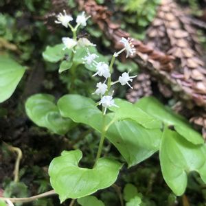マイズルソウ(舞鶴草) 亜高山帯の針葉樹林に生えていてハート形の葉に線香花火の様な白花を咲かせます😃