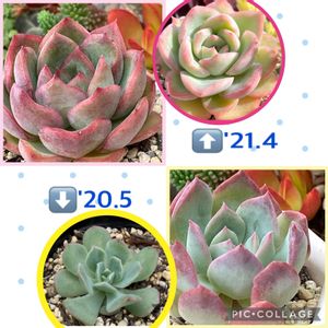 なかなか投稿出来ず 皆さんの所に遊びに行けずごめんなさい🙇♀️ 昨春に交配した子がいつの間にか大きくなっていました💕💕 3苗共に今日の姿です❣️ ママ苗に似たら良い色合いになるかな🤔 ↖️ ママ苗 ティポ ➡️パパ苗 ピンクエッジ ↙️お子ちゃま苗 ティポxピンクエッジ 初めての実生で発芽した子達を☀️に当てたら溶けちゃって😱😱😱 一人っ子になってしまったのでした💧 大切に大きくしなきゃ💖 昨年失敗したので 今春実生した子達は ☀️に当てず溶かす事なくすくすく成長中😆