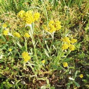 【ハハコグサ(母子草・ゴギョウ)】 キク科越年草 春の七草のひとつ。 日本全土の道端や畑などに普通に見られる。 全体に綿毛におおわれ、白っぽく見える。 黄色い小さな花がつぶつぶになって固まって咲き、真ん中にある筒状の両性花と、周りにある糸状の雌花からなる。 草丈:10~30センチ 花期:4〜6月、花色:黄色 山口県セミナーパークにて