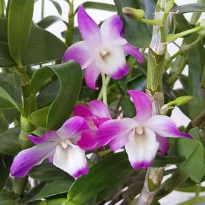今年も咲き出しました。だいぶ前にお嫁さんからいただいた母の日プレゼントのデンドロビウム😊 今は株分けして二鉢に、、、 かわいらしいお花付けるのですが、素人だから、姿形を上手く整えられないのが、、😣😣 蘭は形を整えるのがムズいです😅胡蝶蘭も😣