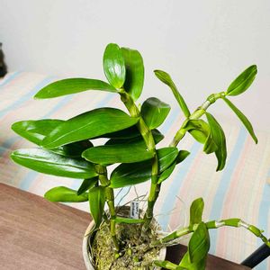 デンドロビウム セカンドラブトキメキ ランはよく分かりませんが、葉っぱ元気。 鉢増しか板付けにするか悩む人。